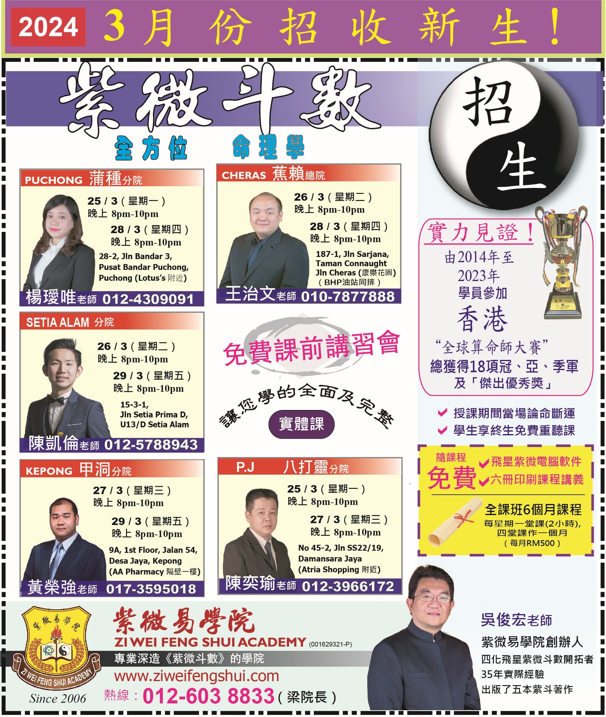 欲知更多详情,请联系各分院老师或参阅 www.ziweifengshui.com,谢谢!