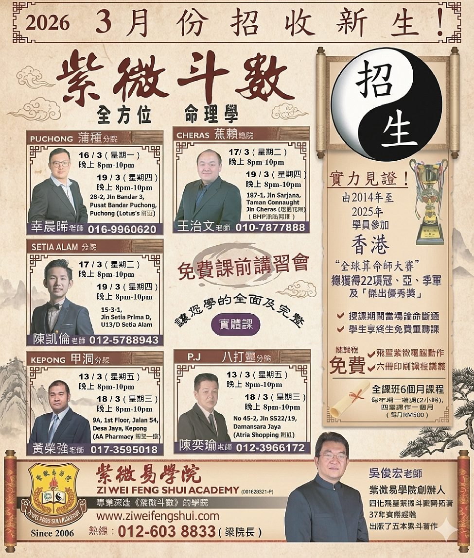 欲知更多详情,请联系各分院老师或参阅 www.ziweifengshui.com,谢谢!